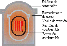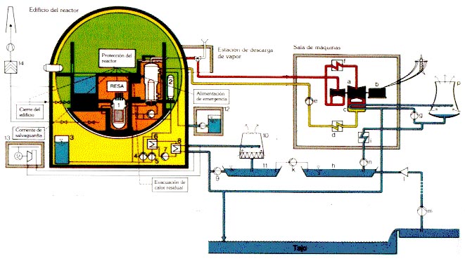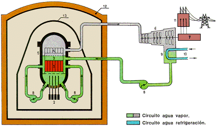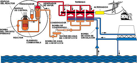 En este esquema se observan las tres partes de una central nuclear tipo: Circuito Primario, (Edificio del Reactor) Circuito Secundario, (Generación de electricidad) y Circuito de Refrigeración
