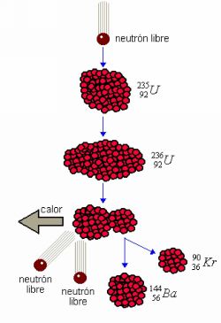 Fisión: En este tipo de reacción, un núcleo pesado se rompe en, generalmente, dos fragmentos cuyos tamaños son del mismo orden de magnitud, lo que va acompañado de una emisión de neutrones y radiación gamma, con la liberación de una gran cantidad de energía. Aunque existen casos de fisión espontánea o de fisión por captura de un fotón, la reacción se produce normalmente por la captura de un neutrón.