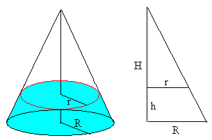 Conocido el radio de la base R del cono y su altura H, tenemos que resolver una ecuación cúbica, para hallar la altura h del tronco de cono, en el instante t.