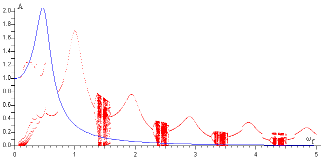 La curva de color rojo, describe el comportamiento del oscilador. Dejamos que el oscilador rebote muchas veces (dependiendo del valor de la constante de amortiguamiento γ), para asegurarnos que se ha alcanzado el estado estacionario, observamos que la partícula rebota hasta múltiples alturas diferentes. El movimiento del sistema nunca se repite es caótico, el periodo es infinito.