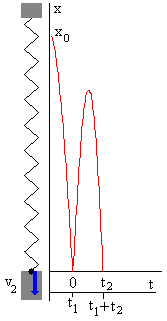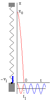 Se determinan los valores de las constantes A, B, C y D de la ecuación de la posición x en función del tiempo t para describir el movimiento de la partícula tras el primer rebote. En la parte superior de la figura, se muestra la posición de la partícula en función del tiempo, hasta el primer rebote. En la parte inferior, la gráfica de la fuerza oscilante f=F·cos(ωf·t+δ).En el instante t=t1 en el que se produce el primer rebote, la fase de la fuerza oscilante, se muestra en color rojo. Segundo rebote