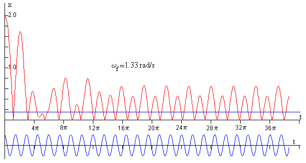 En la parte inferior, la curva de color azul es la fuerza oscilante f=F·cos(ωf·t) La recta de color azul en la parte superior es la amplitud A0 del oscilador forzado en el estado estacionario para la frecuencia ωf=1.28 rad/s de la fuerza oscilante. La curva de color rojo, describe el comportamiento del oscilador que rebota. Después de un estado transitorio que dura algunas oscilaciones, la partícula rebota hasta alcanzar una única altura máxima, esta altura es mayor que la amplitud A0 de la oscilación forzada en el estado estacionario. El movimiento de la partícula se repite después de cada rebote, el sistema precisa de un único rebote para completar un ciclo. Ejemplo 2: En la figura, se muestra el comportamiento del oscilador cuando la frecuencia de la fuerza oscilante es ωf=1.33 rad/s