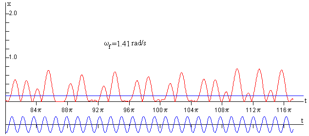 La curva de color rojo, describe el comportamiento del oscilador. Después de un estado transitorio que dura varias oscilaciones, la partícula rebota hasta dos alturas diferentes. El sistema precisa de dos rebotes para completar un ciclo. Aumentamos un poco la frecuencia ωf, y observamos que en el estado estacionario se alcanzan cuatro alturas máximas distintas, el sistema precisa de cuatro rebotes para completar un ciclo, y así sucesivamente... Ejemplo 3: En la figura, se muestra el comportamiento del oscilador cuando la frecuencia de la fuerza oscilante es ωf=1.41 rad/s