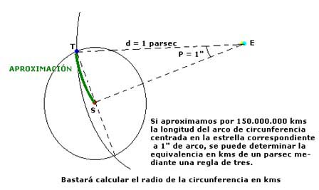 b) Si consideramos una circunferencia con centro en el objeto estelar que se encuentra a un pársec y determinamos su radio en kilómetros podemos hallar también, muy rápidamente, la equivalencia antedicha de 3,26 años luz:
