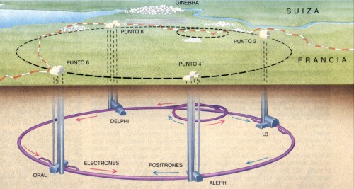 Los electrones y positrones acelerados giran en sentido contrario en un estrecho tubo de vacío a velocidades próximas a la de la luz, realizando el circuito completo unas 11.000 veces por segundo. Sus trayectorias se cruzan en cuatro puntos alrededor del anillo. DELPHI, uno de los cuatro detectores del LEP, es un cilindro horizontal de 3.000 toneladas, de unos 10 m de diámetro y 10 m de largo. Está hecho a base de subdetectores concéntricos, cada uno diseñado para un cometido de recogida especializado. El túnel LEP albergará también el Large Hadron Collider (LHC), gran colisionador de hadrones, que estará acabado en el año 2007.