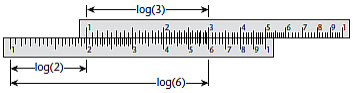 La primera regla de cálculo la construyó un matemático inglés, William Oughtred, en 1630, usando escalas circulares. Modificó el diseño en 1632, haciendo las dos reglas rectas. Esta fue la primera regla de cálculo. La idea es simple; cuando colocas dos varillas en fila, sus longitudes se suman. Si las varillas están marcadas usando una escala logarítmica, en la cual los números están separados según sus logaritmos, entonces los números correspondientes se multiplican. Por ejemplo, se coloca el 1 en una varilla frente al 2 de otra. Entonces, frente a cualquier número x de la primera varilla, tenemos 2x en la segunda. De modo que opuesto a 3 encontramos 6, etcétera (véase la siguiente figura). Si los números son más complicados, digamos que 2,67 y 3,51, colocamos 1 frente a 2,67 y leemos lo que haya enfrentando a 3,59, a saber, 9,37. Es así de fácil.