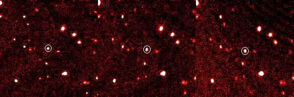 Imágenes del descubrimiento de 2003 UB313, obtenidas el 21 de octubre del 2003, con un intervalo de 1 1/2 horas, mostrando el lento movimiento del nuevo objeto contra el fondo de estrellas, en un intervalo total de 3 horas
