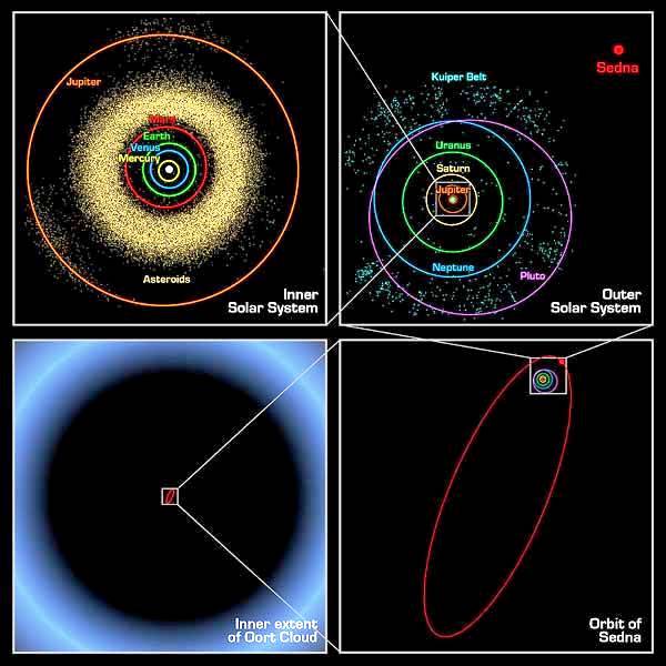 El primer objeto de esta nueva familia planetaria fue descubierto por el equipo de Brown en la noche del 14 de noviembre del 2003. El objeto, confirmado posteriormente por otros observatorios, fue bautizado con el nombre de Sedna, en homenaje a la diosa de los océanos árticos, del pueblo de los Inuit (nombre con el que se conocen a los esquimales canadienses). El objeto, cuyas estimaciones modernas de su diámetro lo sitúan entre 1.200 a 1.800 kms., está situado a unos 13.000 millones de kms. del Sol, y con un período de revolución equivalente a 12.260 años, le convierten en el objeto más lejano del cortejo planetario solar.