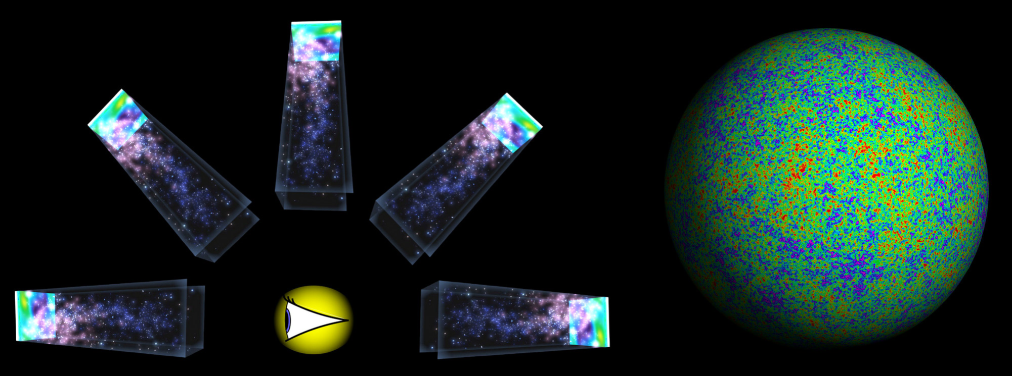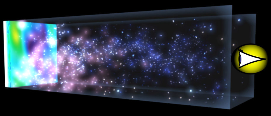 En otras palabras, Gamow predijo que nuestro universo comenzó con una Gran Explosión, y que hubo una época en que el plasma llenaba todo el espacio. Lo especialmente interesante de esto es que se trata de una predicción comprobable: si bien el gas hidrógeno frío es transparente e invisible, el plasma de hidrógeno caliente es opaco y fulgura con intensidad, como la superficie del Sol. Esto significa que a medida que miramos más lejos en el espacio, como en la figura, nos topamos con galaxias viejas cercanas, a continuación con galaxias jóvenes detrás de ellas, después con gas hidrógeno transparente y, por último, con una pared de plasma de hidrógeno brillante. No podemos ver más allá de esa pared porque es opaca y, por tanto, bloquea el acceso a lo que hubo antes, como un censor cósmico. Es más, tal como ilustra la siguiente figura, eso es lo que se ve en todas direcciones, ya que miremos hacia donde miremos, siempre retrocedemos en el tiempo. Así que da la impresión de que estamos rodeados por una esfera de plasma gigantesca.