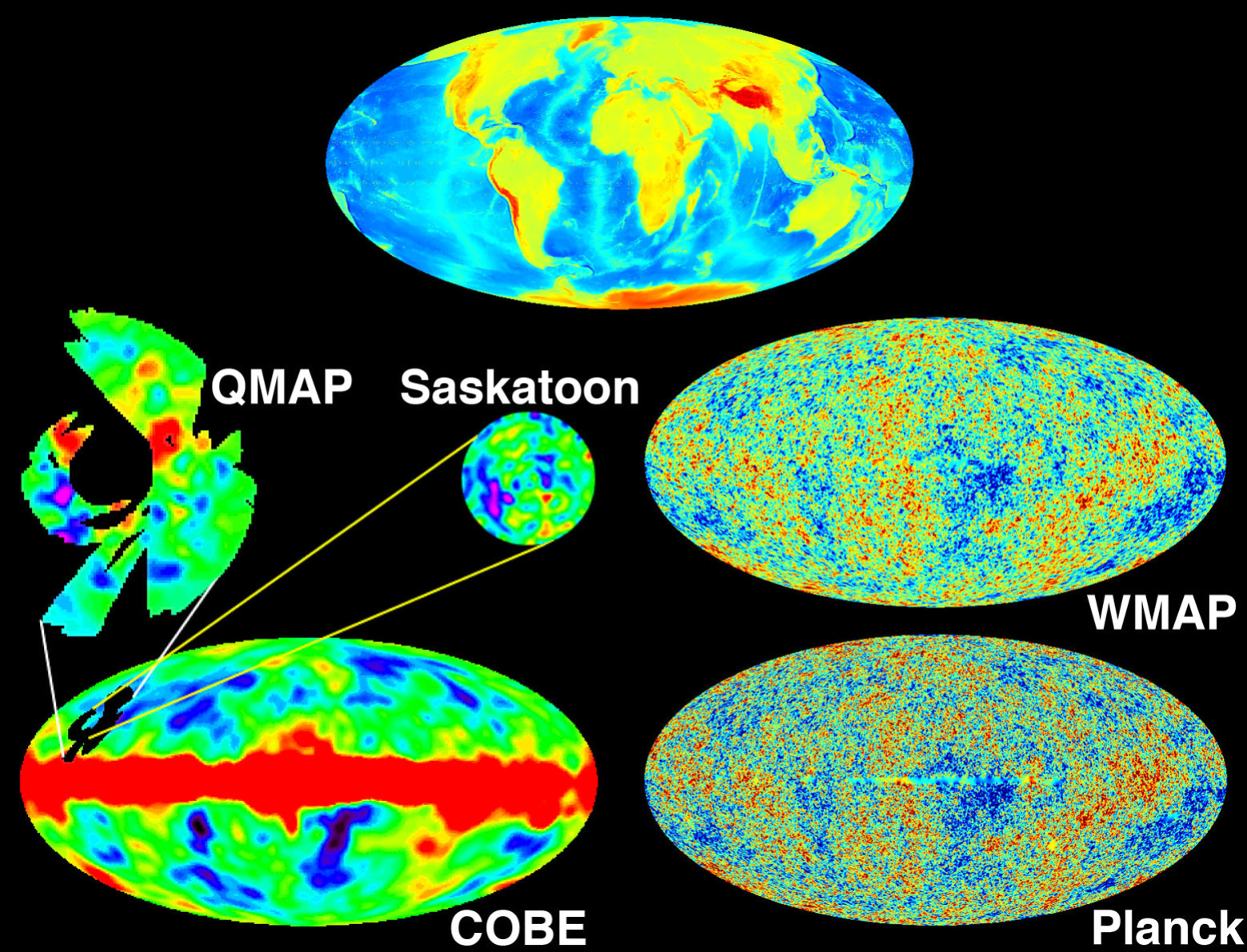 Figura: Cuando se exhiben mapas de todo el cielo conviene proyectarlos sobre una hoja plana, tal como hacemos con los mapas terrestres (arriba), aunque de forma que se interpreten mirando hacia arriba, hacia el cielo, en lugar de mirando hacia abajo, hacia el suelo. La «imagen de nuestro universo recién nacido» del COBE (izquierda inferior) era bastante borrosa, lo que alentó numerosos experimentos para ampliarla a base de imágenes de pequeñas porciones de cielo con una resolución mayor (centro izquierda) antes de que los satélites WMAP y Planck obtuvieran mapas de alta resolución de todo el cielo (derecha) de 3 megapíxeles y 50 megapíxeles, respectivamente. Esos mapas del cielo aparecen rotados en relación con el mapa terrestre, de manera que el plano central de cada uno de ellos no se corresponde con el plano del ecuador terrestre, sino con el plano de la Galaxia (banda gris de la imagen de la izquierda inferior); el polo norte de la Tierra apunta hacia el centro del mapa Saskatoon. (Mapa terrestre de Patrick Dineen).