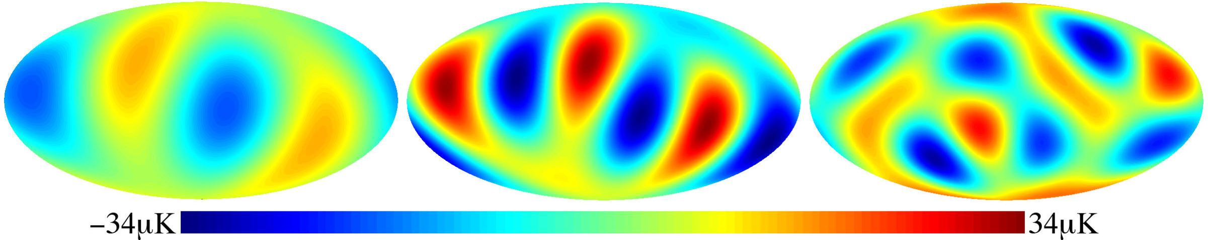 Figura: Al descomponer el mapa del WMAP que aparece en la figura en una suma de multipolos que muestran trozos de un tamaño cada vez más reducido, los dos primeros (mapas de izquierda y centro) revelan un misterioso alineamiento alrededor de lo que se ha apodado como «eje del mal». Los diferentes colores indican cuánto más caliente o frío que la media se encuentra el cielo en distintas direcciones; la barra inferior indica la escala en µK, millonésimas de grado
