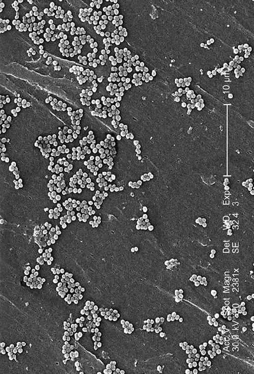 Microscopía electrónica de barrido con una preparación que muestra numerosos Staphylococcus aureus