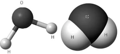 Figura 1. Dos representaciones de la molécula de agua, H2O. El ángulo que forman los dos enlaces covalentes O−H es de 104,45º y la longitud del enlace es de 95,84 pm (1 pico-metro (pm) = 10-12 metros).