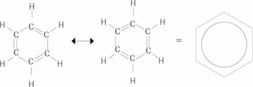 Figura 3. Las dos estructuras resonantes de Kekulé para la molécula de benceno (en el plano de la hoja de papel). Los electrones π están de hecho deslocalizados a lo largo del anillo hexagonal, por arriba y por abajo del plano molecular, es decir, de la hoja de papel. Ni la una ni la otra son buenas representaciones de la molécula, sino una combinación lineal (o superposición) entre ellas. Se acepta hoy en día que la mejor representación es un anillo bencénico y dentro un círculo que indica que los electrones π del doble enlace están orbitando por arriba y por abajo del plano.