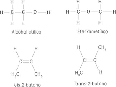 Figura 5. Isómeros con fórmulas químicas C2H6O para el alcohol etílico y éter dimetílico y los isómeros cis y trans de la molécula 2-buteno.