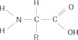 Figura 6. Fórmula química de un aminoácido. El grupo carboxilo (COOH) tiene carácter ácido (es capaz de liberar protones, H+) y el grupo amino (NH2) carácter de base (capaz de atraer protones). R es una cadena lateral o radical formada por un solo átomo como el H o mucho más complicada formada por grupos de átomos; por ejemplo, R podría ser – CH3, —CH2 —CH2 —COOH, —CH2 —CONH2, etc.