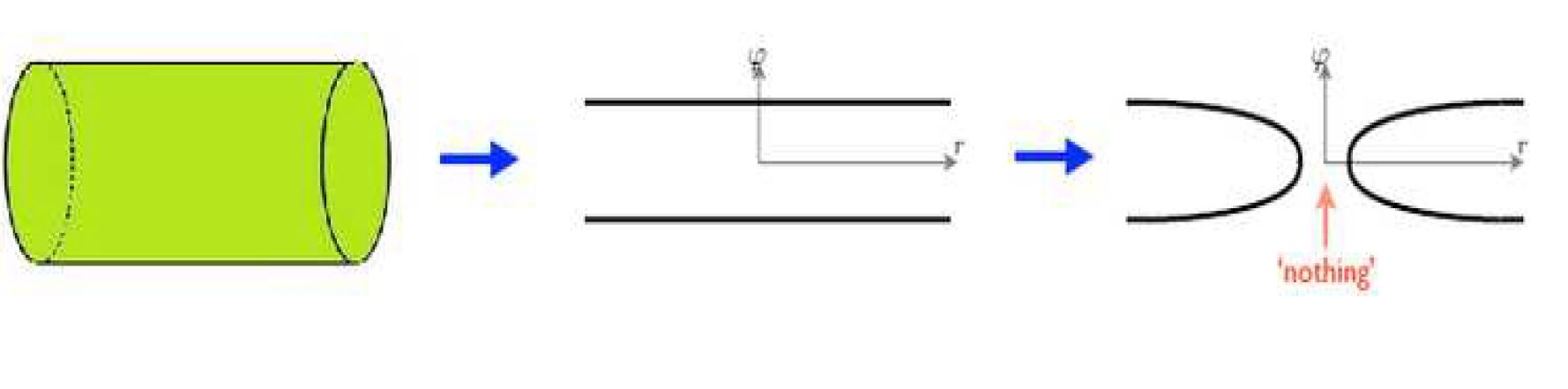En esta imagen, el primer dibujo representa el Universo 4D con una dimensión adicional enrollada en un círculo. El segundo representa una sección transversal del cilindro: la coordenada vertical representa la dimensión adicional y la horizontal nuestras 4 dimensiones usuales. El tercer dibujo representa la aparición de una burbuja de nada: la dimensión adicional "se desinfla" en el punto r=0 de forma que cualquier sección a lo largo del eje r incluye un agujero. Este agujero no contiene nada, ni siquiera espacio-tiempo.