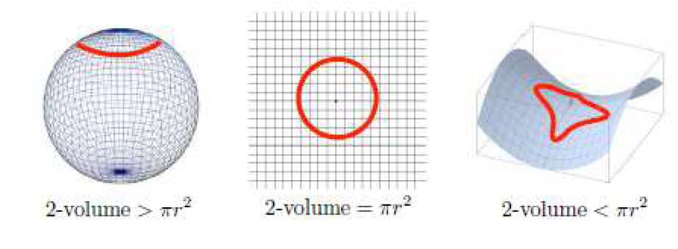 Una forma más clara de entender esto es la siguiente: un círculo en un espacio-tiempo con curvatura positiva encierra un "volumen" bidimensional mayor que la superficie del círculo (los ángulos de un triángulo miden más de 180º). Un círculo en un espacio-tiempo con curvatura nula (un plano) encierra un "volumen" bidimensional igual al de la superficie (Πr2). Un círculo en un espacio-tiempo negativo (silla de montar) encierra un "volumen" bidimensional inferior al de su superficie. Es decir, en un espacio-tiempo con curvatura negativa, el 2-volumen encerrado por un círculo es más pequeño que la superficie del círculo.