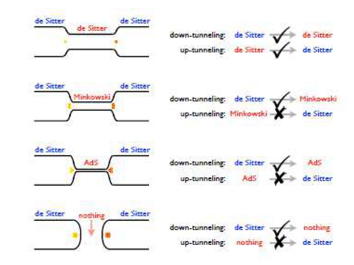Esto implica algo muy importante: la transición cuántica desde espacio-tiempos planos o con curvatura negativa hasta Universos de D dimensiones es imposible, lo cual nos lleva a la siguiente conclusión: no es posible la transición desde una burbuja de nada hasta un Universo como el nuestro. Aunque ambas están descritas por el mismo proceso, en el caso de la transición de B a A la probabilidad de transición que obtenemos es nula. Es más, en principio, cualquier transición desde un Universo con curvatura negativa o plana (AdS o Minkowski) a un Universo con curvatura positiva (de Sitter o dS) estaría prohibida.