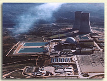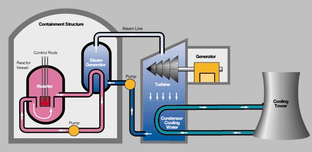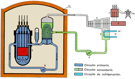 En este esquema se observan las tres partes de una central nuclear tipo: Circuito Primario, (Edificio del Reactor) Circuito Secundario, (Generación de electricidad) y Circuito de Refrigeración
