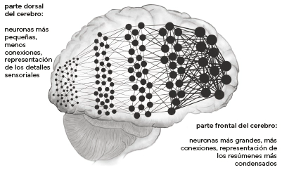 Algo similar ocurre con las neuronas de nuestro cerebro. Puede haber una gran neurona (el inspector) que reciba de manera simultánea señales de montones de otras neuronas más pequeñas (los testigos) que se activan a ritmos distintos. La neurona grande no expresa todas las señales de las neuronas más pequeñas: las resume, o condensa, reduciendo la redundancia. Tras esa condensación, la neurona grande puede transmitir de manera eficiente ese resumen a otras neuronas. Este proceso neuronal de condensación se ejecuta a gran escala en todo el cerebro. En nuestra corteza cerebral, la condensación se inicia conpequeñas neuronas que transportan datos sensoriales procedentes de los ojos, los oídos y otros órganos.5 Es posible que nuestro cerebro ya haya predicho algunos de esos datos, mientras que otros serán nuevos. Los nuevos datos sensoriales pasan de las neuronas pequeñas a otras mayores ymejor conectadas, que condensan los datos en forma de resúmenes. Esos resúmenes se transmiten a otras neuronas aún mayores y mejor conectadas, que a su vez condensan los resúmenes y los transmiten a otras neuronas todavía mayores y aún mejor conectadas. Esta actividad se repite hasta llegar a la zona frontal del cerebro, un área densamente cableada donde las neuronas de mayor tamaño y dotadas de un mayor número de conexiones crean los resúmenes más generales y más condensados de todo el proceso.