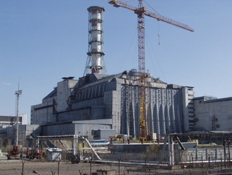 Vista del sarcófago que cubre los restos del reactor número 4.