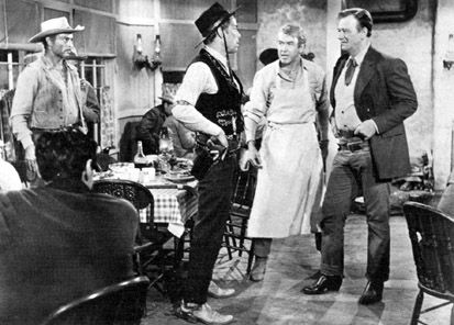 película Stewart se percata de que cuando van a enterrar a Wayne sus armas no