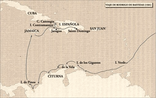 En 1502 embarcaron de regreso en los barcos del depuesto gobernador Francisco de Bobadilla.Viaje de Rodrigo de Bastidas (1501). Las cartas trazadas por Juan de la Cosa y las informaciones dadas a los mismísimos Reyes Católicos animaron nuevas exploraciones e intentos de colonización y comercio. El mismo Rodrigo, en 1504, era ya un próspero mercader caribeño. Establecido en La Española se dedicó a invertir en ganado bovino y, asociado a Diego Colón, a importar esclavos indios capturados en las islas cercanas de las Lucayas (Bahamas). También entre 1519 y 1521 obtuvo pingües beneficios con la extracción y el comercio de perlas. En 1521, el rico empresario ofreció a Hernán Cortes –a quien conocía al menos desde once o doce años antes– tres barcos, hombres y dinero para concluir la conquista de México. Ese mismo año, obtuvo licencia para colonizar y explorar las costas de Tierra Firme. Poco después, fue nombrado gobernador de la zona, trasladó colonos, estableció diversos pactos de paz y comercio con las tribus nativas y fundó la ciudad de Santa Marta (Colombia, 1524), luego abandonada.