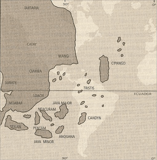 Concepción atlántica según el mapamundi de Martín Behaim (1492). El globo terráqueo de Behaim es la esfera europea conservada más antigua que presenta la visión del mundo, en especial del Atlántico, muy parecida a como la pensó Colón. La concepción de Behaim mantiene las antiguas teorías sobre la relación de los continentes con los océanos, teorías transmitidas desde la época griega y reelaboradas y perfeccionadas por intelectuales medievales como Roger Bacon, el cardenal d’Ailly y Toscanelli, y plenamente asumidas por Colón. El horizonte colombino era la mítica isla de Cipango (Japón) en la que, según la leyenda extendida por Marco Polo, abundaban el oro, las piedras preciosas y las especias. Por otro lado, el Tratado de Alcáçovas de 1479 impedía a los Reyes Católicos la expansión marítima meridional por el camino de levante hacia las Indias. Si el proyecto de Colón tenía éxito, podría evitar la situación de inferioridad a la que se veían abocados y abriría excepcionales posibilidades a las ansias expansionistas de los castellanos.