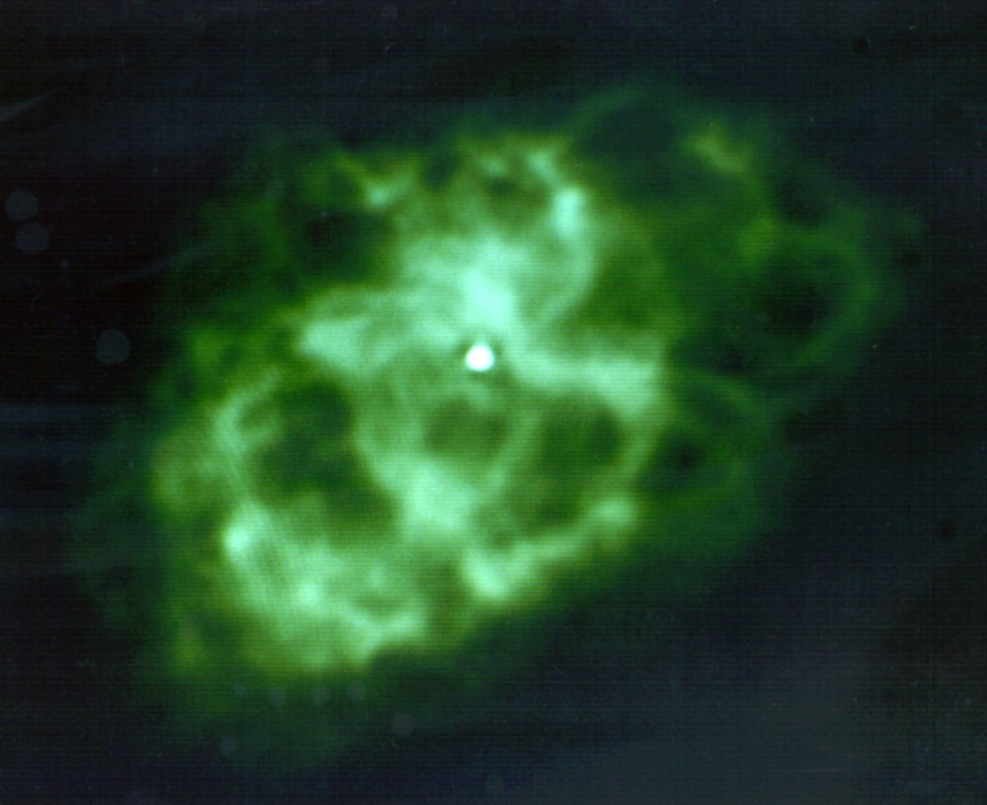 Ondas de Radio, Rayos X, Campos magnéticos fuertes...los científicos supieron que la Nebulosa del Cangrejo era una fuente poderosa de radiación, pero ¿cual era su origen? Lo descubrieron en 1968: un objeto en el centro de la nebulosa (la estrella prominente de Baade) emitía pulsos de radioondas 30 veces por segundo. El llamado Pulsar del Cangrejo, está entre los primeros pulsares descubiertos, y es el pulsar más rápido y más enérgico formado de una explosión de supernova.