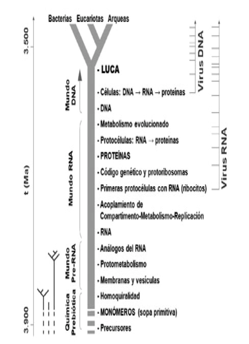 Principales eventos ocurridos durante el origen y la evolución temprana de la vida en la Tierra, a lo largo del tronco del árbol que conecta los precursores químicos con LUCA. Los árboles evolutivos más pequeños muestran la posibilidad de que la vida surgiera más de una vez y se diversificara hasta cierto punto en distintos entornos de nuestro planeta. Se indica también las posibles épocas en las que se originaron los virus con genoma de RNA y de DNA.