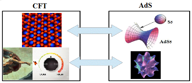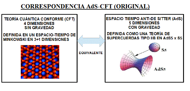 En 1997 el físico teórico Juan Maldacena publicó el que sería el trabajo más citado de la historia de la física teórica. En este trabajo presentó el que probablemente es el avance más importante sobre gravedad cuántica de las últimas décadas. La conclusión de este trabajo es sencilla pero increíblemente poderosa: una teoría cuántica de campos (conforme) definida en D dimensiones es físicamente indistinguible de una teoría de la gravedad (cuántica) definida en un espacio-tiempo AdS en D+1 dimensiones. Este es un ejemplo grandioso del poder de la Física-Matemática: dos sistemas completamente diferentes (con y sin gravedad y definidos en distintas dimensiones) son físicamente equivalentes. Esto es posible básicamente porque las simetrías y los operadores cuánticos que definen ambos sistemas son los mismos. El gran poder de esta correspondencia es que por primera vez podemos explorar características de la gravedad cuántica (el lado AdS) simplemente analizando las características de sistemas cuánticos ordinarios (lado CFT). Metafóricamente hablando es como si analizando las propiedades de un circuito electrónico pudieras obtener información sobre el espacio-tiempo que lo contiene.