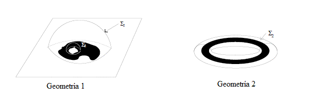 En la geometría 1 y en la geometría 2 se consigue un espacio-tiempo de 5 dimensiones "fusionando" (fibrando) una esfera de 3 dimensiones con la superficie bidimensional que aparece sombreada en las figuras.