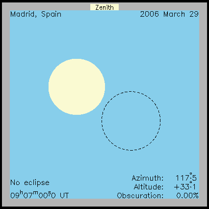 Aunque los eclipses totales de Sol son bastante frecuentes, al cubrir éstos zonas muy estrechas de la superficie terrestre debe transcurrir, por término medio, bastante tiempo para que se repitan en el mismo lugar. El último eclipse total de Sol visto desde Madrid ocurrió el 8 de julio de 1842; el próximo eclipse total visible desde España ocurrirá el 12 de agosto del año 2026. El pasado 3 de octubre de 2005, tuvimos la gran ocasión de contemplar desde Madrid un eclipse anular de Sol.