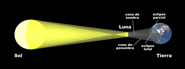 La Luna proyecta un cono de sombra en el espacio en la dirección opuesta al Sol, y en las zonas terrestres barridas por ese cono se observan los eclipses totales.