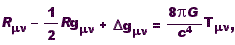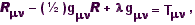 donde Rmn es el tensor de Einstein (derivado de la curvatura tensorial de Riemann), gmn la función de g, R la curvatura escalar, l la constante cosmológica, y Tmn el tensor de energía.