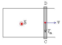 Al moverse la varilla hacia la derecha, con velocidad v en el seno de un campo magnético uniforme B, los portadores de carga se mueven con la misma velocidad horizontal. La fuerza sobre dichos portadores es f=q·v´B Como v y B son perpendiculares, el módulo de la fuerza es f=qvB. La dirección de la fuerza es la de la varilla y el sentido de D a C. Tenemos por tanto un sistema de "bombeo" de carga positiva desde D hacia el extremo C, análogo al del generador de Van de Graaff desde la base hacia la esfera conductora. De menos potencial a más potencial. El campo En que impulsa las cargas (fuerza por unidad de carga) es En=vB y solamente existe en el tramo DC de la varilla