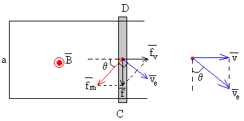 Los portadores de carga se mueven horizontalmente con velocidad v y también a lo largo de la varilla, de D a C. La velocidad de los portadores de carga positivos ve hacen un ángulo θ, con la varilla, de modo que la componente horizontal de la velocidad de los portadores de carga debe ser igual a la velocidad constante v de la varilla, ve·senθ=v. Las fuerzas sobre los portadores de carga son: