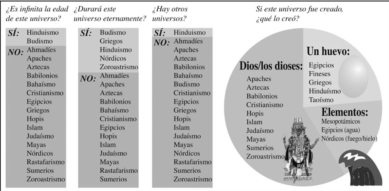 No hay duda de que durante todo el tiempo que nuestros ancestros humanos han deambulado por la Tierra se han preguntado en qué consiste la realidad mediante el planteamiento de grandes cuestiones existenciales. ¿De dónde salió todo? ¿Cómo acabará? ¿Qué tamaño tiene el todo? Estos interrogantes son tan seductores que prácticamente todas las culturas humanas del orbe los han abordado y han transmitido respuestas de generación en generación, en forma de elaborados mitos, leyendas y doctrinas religiosas de la creación. Tal como ilustra la figura 2, se trata de preguntas tan difíciles que no ha habido ningún consenso global para darles respuesta.