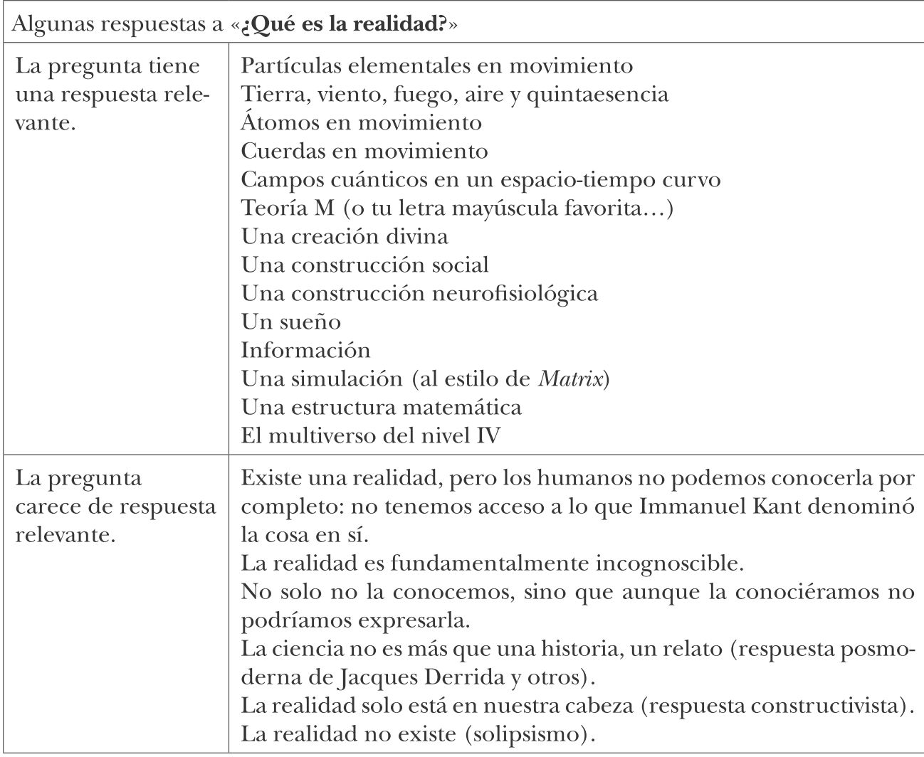 Una de las razones por las que los pensadores han brindado ese amplio espectro de respuestas estriba sin duda en que han optado por interpretar el interrogante de maneras diferentes. La palabra realidad tiene distintas connotaciones. Aquí la uso para referirme a la naturaleza última del mundo físico exterior del que formamos parte, y me fascina la idea de aspirar a comprenderla mejor. El interrogante de «¿qué es la realidad?» representa la mayor aventura detectivesca, y considero una suerte inmensa que se pueda dedicar una fracción muy grande de nuestro tiempo a esclarecerla.