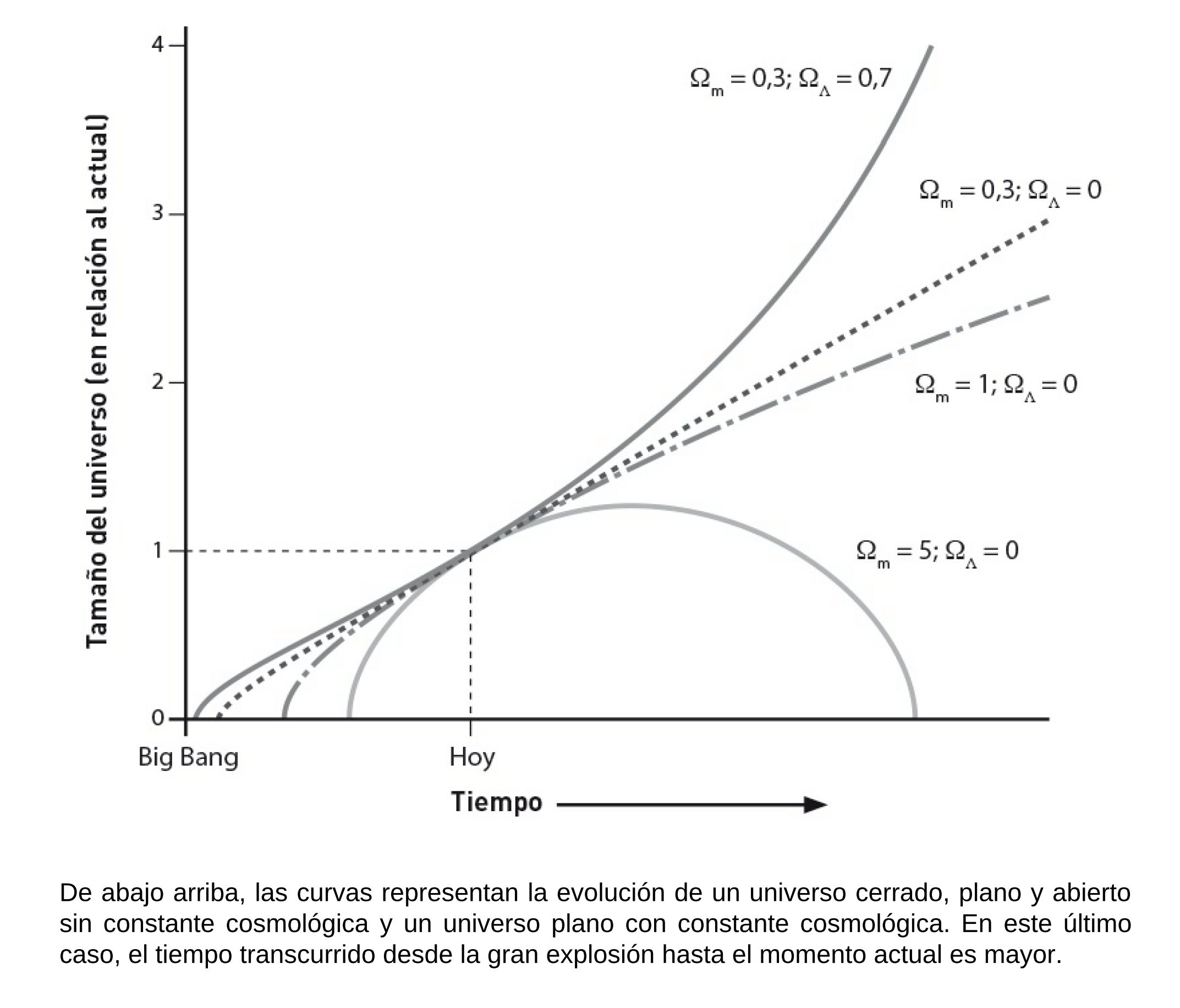 Algunos científicos notaron que estas discrepancias podían resolverse recuperando la constante cosmológica desechada por el físico alemán. En particular, con ella se incrementaba considerablemente la edad del Universo predicha por la teoría. En efecto, dado que el efecto de una constante cosmológica positiva es acelerar la expansión del Universo (al contrario que la materia, cuya atracción gravitatoria trata de frenarla), un Universo dominado por una constante cosmológica habría crecido más lentamente en el pasado, tardando más tiempo en alcanzar su tamaño actual. Esto lo podemos ver en la figura 1, donde Ωm y ΩɅ son la densidad de materia y la densidad asociada a la constante cosmológica (en unidades de la densidad crítica). La suma de estas dos cantidades, Ωm+ ΩɅ, determina la geometría menor, igual o mayor que 1.