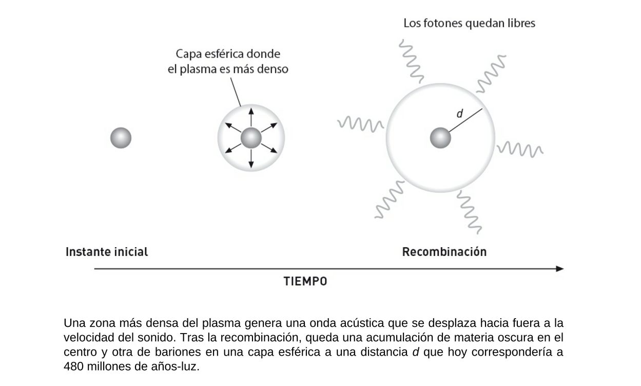 Para entender por qué, supongamos un modelo simplificado en que el plasma primitivo es completamente uniforme excepto en un punto donde es más denso (fig. 2). La presión de los fotones se resiste a la compresión y empuja el plasma hacia fuera, creando una onda acústica, una «ola» que viaja por el plasma a la velocidad del sonido. La materia oscura, mientras tanto, como está desacoplada del plasma, permanece en el punto inicial. En el momento de la recombinación, la onda ha tenido tiempo de recorrer una determinada distancia d, que corresponde actualmente a 480 millones de años-luz. Entonces, los fotones quedan libres y lo que tenemos es una acumulación de materia oscura en el punto inicial y otra de bariones en una capa esférica de radio d. Ambas zonas actuarán como «semillas» que atraerán más y más materia y acabarán formando galaxias.