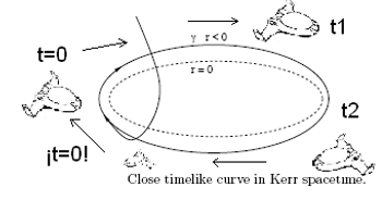 El anillo de la singularidad es una superficie "time-like"; esto quiere decir que es una trayectoria en el tiempo realizable físicamente. Si nos situáramos justo al lado del anillo y realizásemos una trayectoria cerrada alrededor del mismo, viajaríamos a lo largo de la dimensión temporal por lo que ¡volveríamos de nuevo al punto de partida, volveríamos al pasado! ¡Esto sí sería realmente un viaje en el tiempo hacia el pasado!