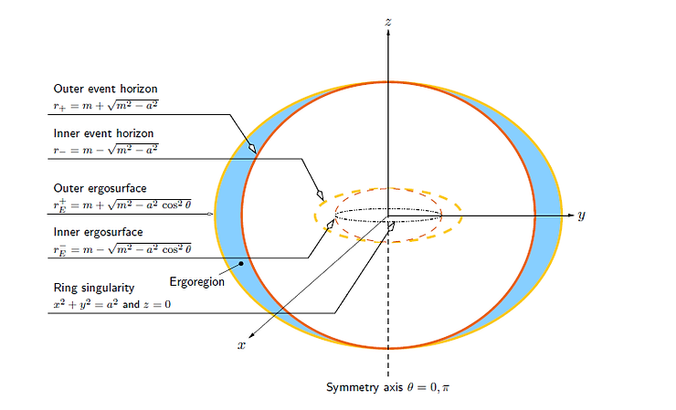 Las componentes positivas son espaciales y las negativas son temporales. Un cuerpo puede moverse libremente por las componentes espaciales, pero la componente temporal siempre "fluye" en la misma dirección y "arrastra" a todos los cuerpos en esa dirección. Los puntos anteriores determinarán las tres zonas principales de un agujero negro de Kerr: el horizonte de sucesos, la ergosfera y la singularidad.