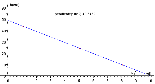 Primera experiencia Se activa el botón de radio titulado Altura. Se pulsa el botón titulado Inicio Con el puntero del ratón, se arrastra la flecha de color azul, para rellenar el recipiente con un volumen de agua Va. Se pulsa el botón titulado Empieza La bola describe un movimiento armónico simple. El volumen Va (en litros) de agua y la altura de caída h (en cm) se guardan en el control área de texto situado a la izquierda del applet Se pulsa el botón titulado Inicio Con el puntero del ratón, se arrastra la flecha de color azul, para rellenar el recipiente con otro volumen de agua Va distinto Se pulsa el botón titulado Empieza La bola describe un movimiento armónico simple. El volumen Va (en litros) de agua y la altura de caída h (en cm) se guardan en el control área de texto situado a la izquierda del applet. Cuando tengamos suficientes datos, se pulsa el botón titulado Gráfica, para representar los resultados “experimentales” (puntos de color rojo) y la recta de "ajuste".