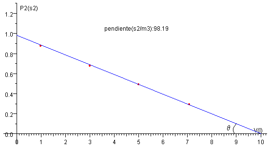 Ejemplo Seleccionamos Argón, y activamos el botón de radio titulado Periodo Medimos el periodo de cinco oscilaciones con el cronómetro para varios valores del volumen Va de agua. Pulsamos el botón titulado Gráfica. A partir de la pendiente de la recta determinamos el índice adiabático del gas considerado. La pendiente de la recta de la figura es -1.0/0.01=-100 s2/m3 El programa nos proporciona una pendiente de -98.19 s2/m3 Medimos la ordenada en el origen 1.0 s2, o bien, conocida la tangente del ángulo y el cateto contiguo (10 litros=0.01 m3) calculamos el cateto opuesto (la ordenada en el origen) 98.19·0.01=0.9819 m
