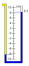 La diferencia de presión p-p0 entre le gas contenido en el recipiente y la presión atmosférica es Cuando la bola se ha desplazado x=h, la diferencia de presión es es constante e independiente del tipo de gas y del volumen V0-Va del recipiente que lo contiene. La diferencia de presión corresponde a 1608=1000·9.8·(2x) a un desnivel 2·8.2 cm entre las dos ramas del manómetro de agua. Cuando la bola pasa por la posición de equilibrio h/2=0.17 cm, la diferencia de presión es la mitad del valor anterior. Se pulsa el botón titulado Pausa y luego, varias veces el botón titulado Paso, para acercarnos a la posición de de máximo desplazamiento. Como vemos el manómetro no nos suministra información acerca del tipo de gas que experimenta la transformación adiabática, solamente nos da información acerca de la masa y radio de la bola que dejamos caer en un tubo de igual radio.