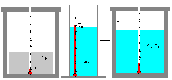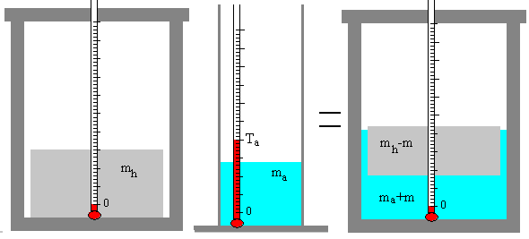 En la experiencia que se describe a continuación, se emplea el procedimiento de las mezclas pero no se tiene en cuenta las pérdidas o ganancias de calor entre el calorímetro y el medio ambiente. Una masa ma de agua a la temperatura inicial Ta se mezcla con una masa mh de hielo a 0º C en un calorímetro. La mezcla de agua y hielo se agita hasta que se alcanza una temperatura final de equilibrio Te. Pueden ocurrir dos casos