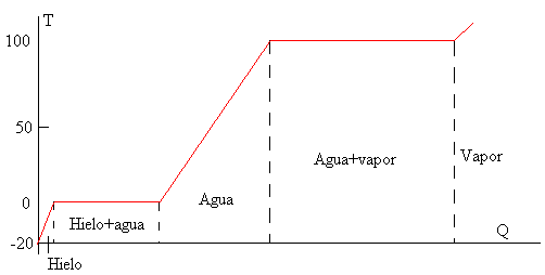 En la figura, se muestra cómo se va incrementando la temperatura a medida que se aporta calor al sistema. La vaporización del agua requiere de gran cantidad de calor como podemos observar en la gráfica (no está hecha a escala) y en los cálculos realizados en el ejemplo. Si disponemos de una fuente de calor que suministra una energía a razón constante de q J/s podemos calcular la duración de cada una de las etapas