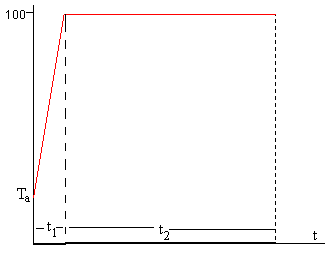 Se pulsa el botón titulado Empieza Se observa como la temperatura del agua se va incrementando con el tiempo hasta que en el instante t1 el agua empieza a hervir. A partir de ese momento, el agua se va evaporando a la temperatura constante de 100ºC, empleando un tiempo t2 en dicho proceso. Usando los botones titulados Pausa/Continua y Paso se miden los tiempos t1 y t2. Ejemplo: